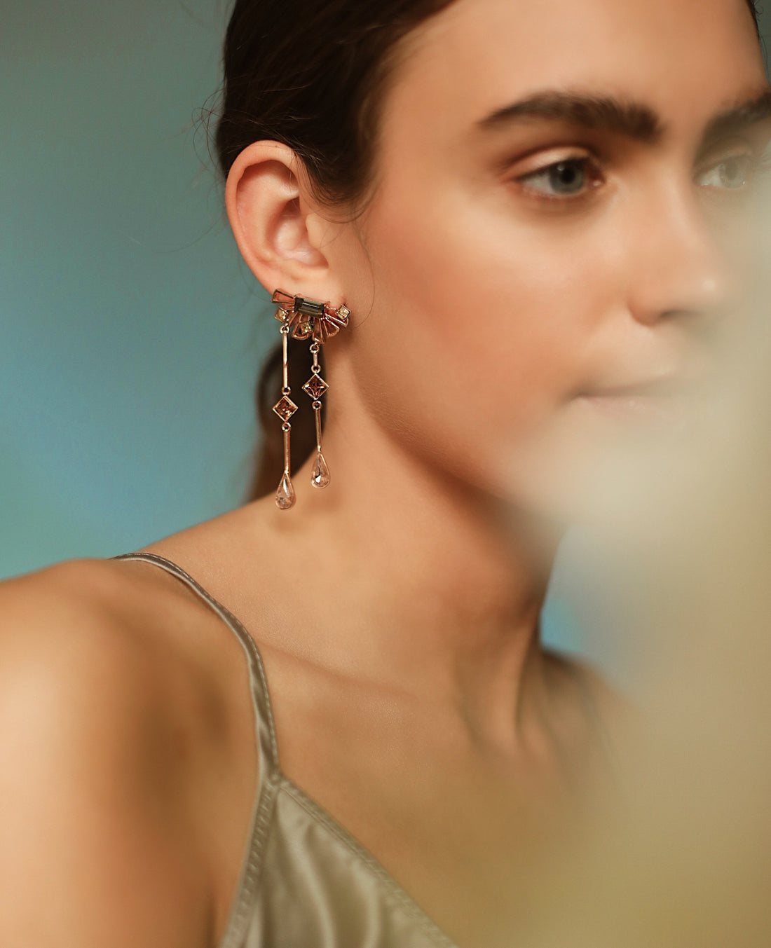 Featuring a pair of very soft and elegant danglers with a little swarovski drop hangings...