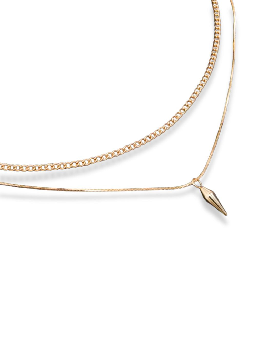 The structured chain represents grounding and resilience, while the sleek drop pendant marks a decisive moment of becoming.