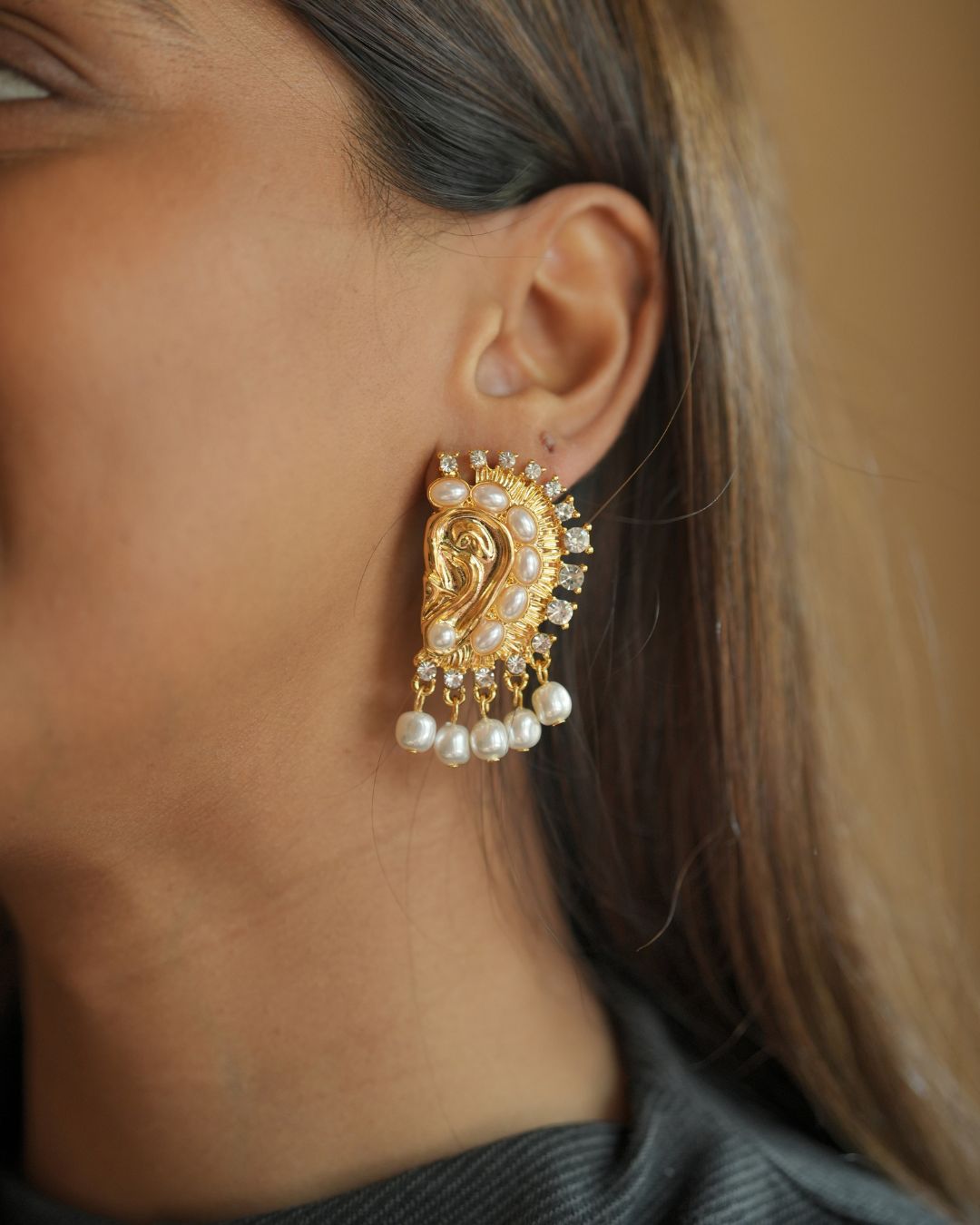 Designed with an intricate gold paisley form that hugs the ear’s natural outline, it is adorned with luminous pearls, delicate crystal accents, and soft pearl drops that move beautifully with every turn.