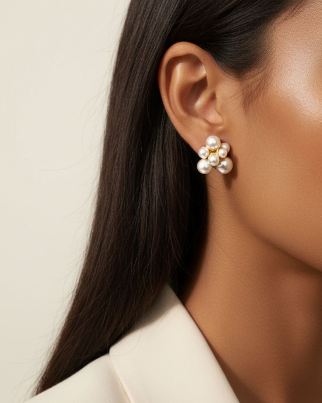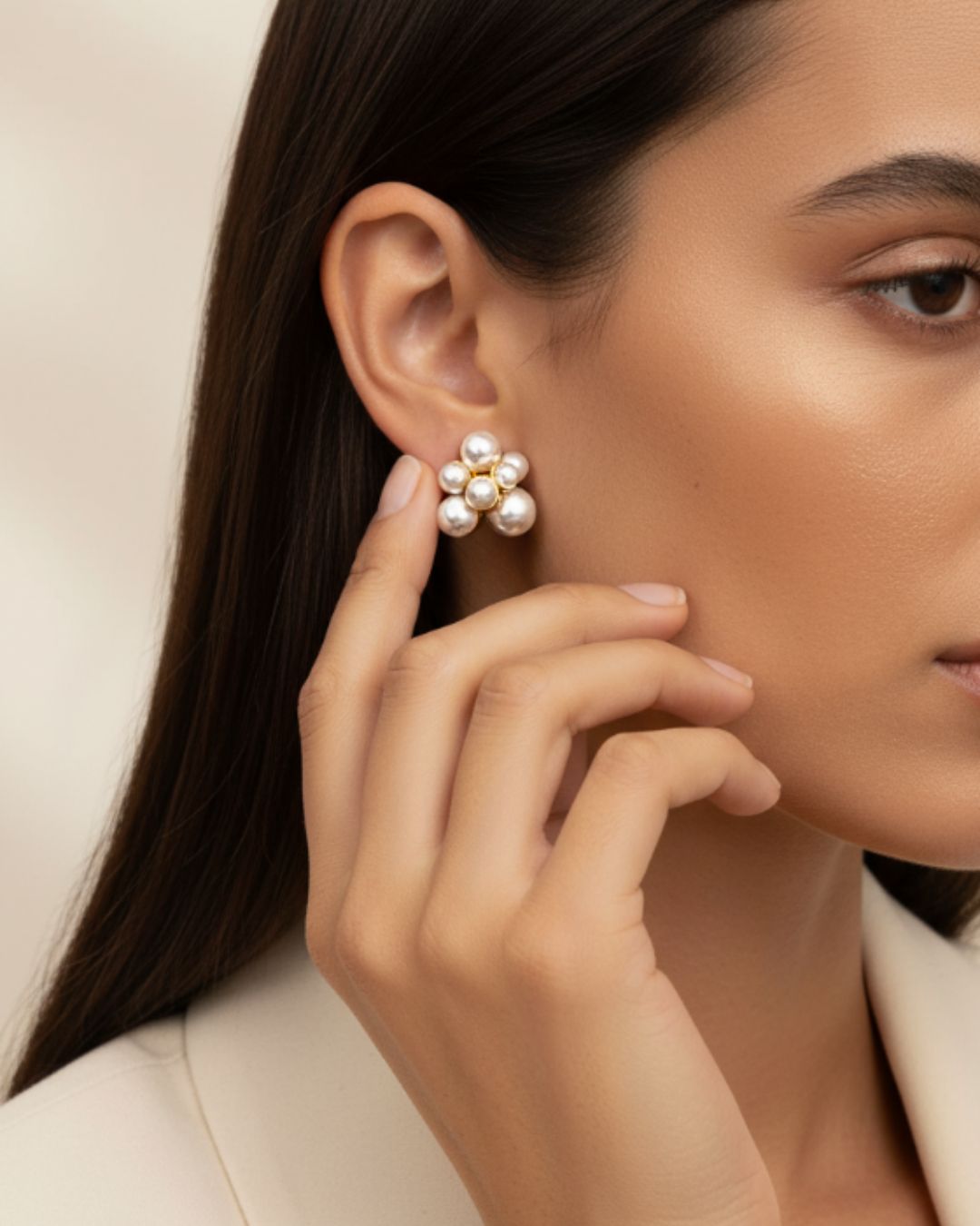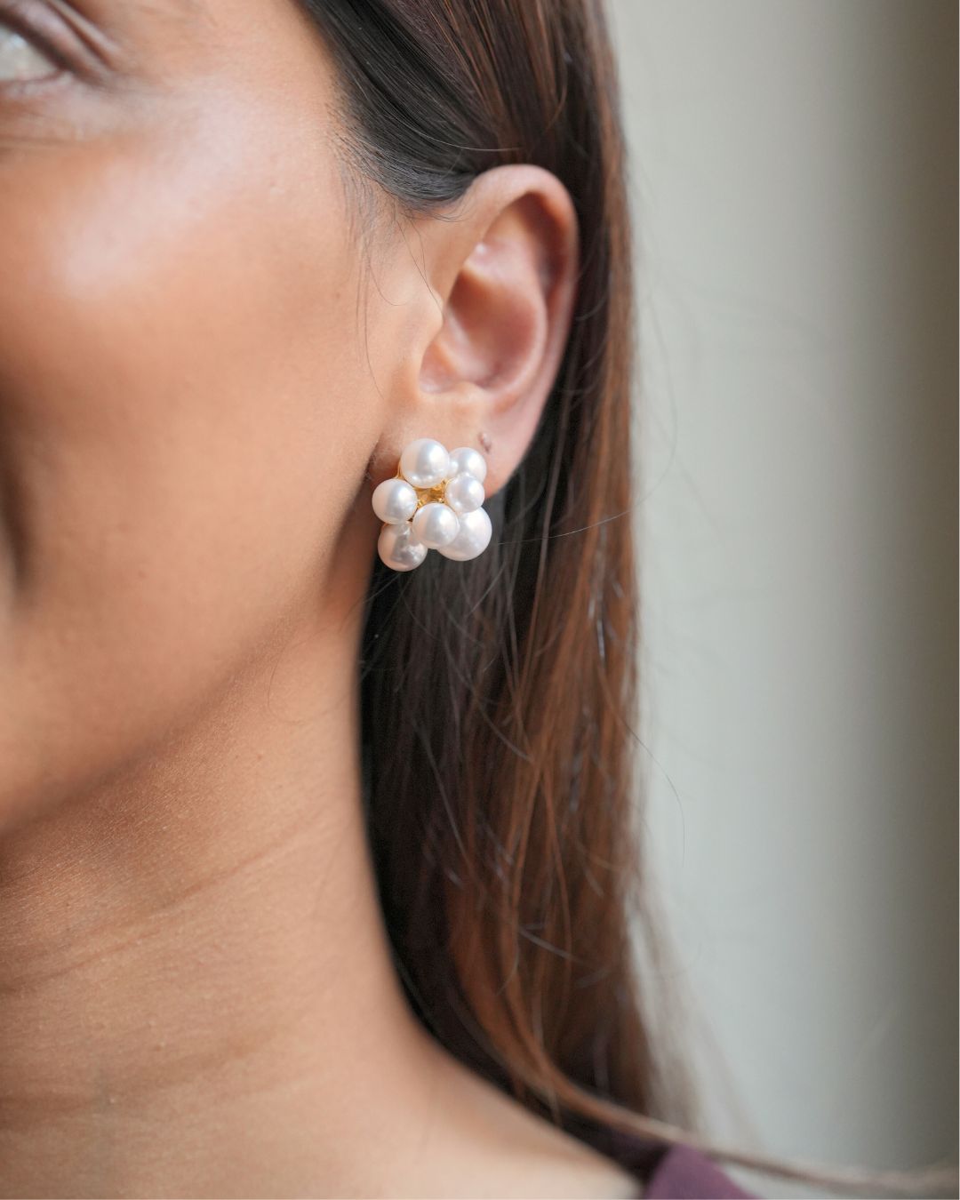 Crafted from tiny, luminous pearls arranged in a rounded bloom, this medium-sized stud brings a refined yet youthful charm to any look.